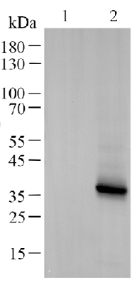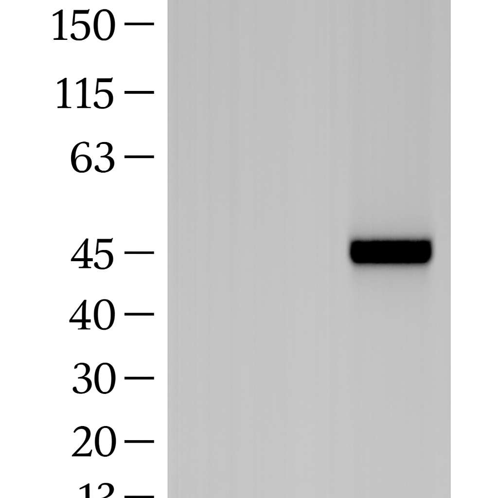 WB检测—靶蛋白在45kDa位置呈现单一条带,特异性高,无明显背景
