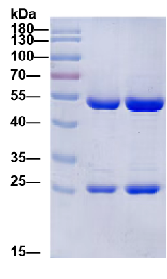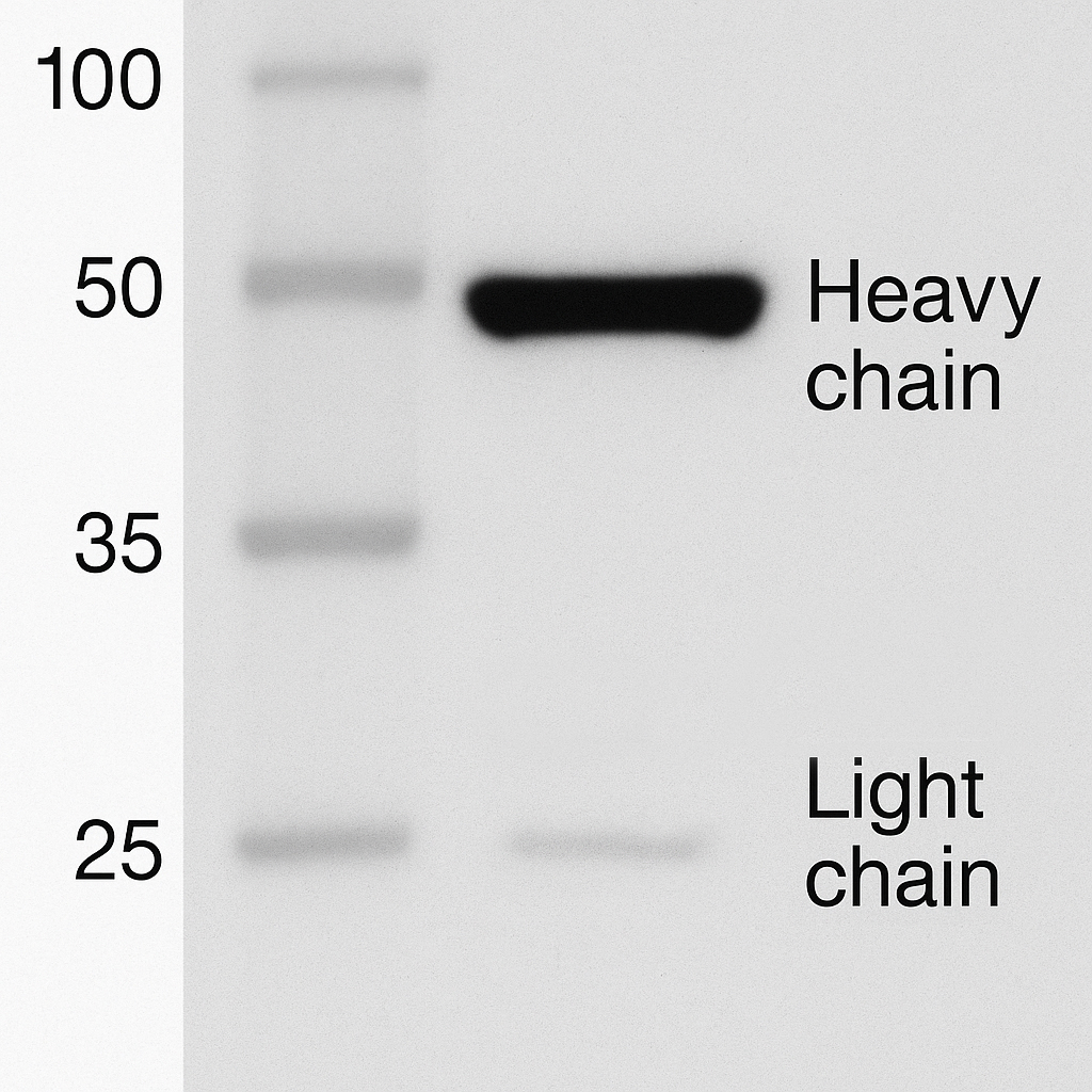 SDS-PAGE 检测结果:还原条件下,重组抗体呈现约 50 kDa 的重链和约 25 kDa 的轻链条带,纯度高、结构完整。